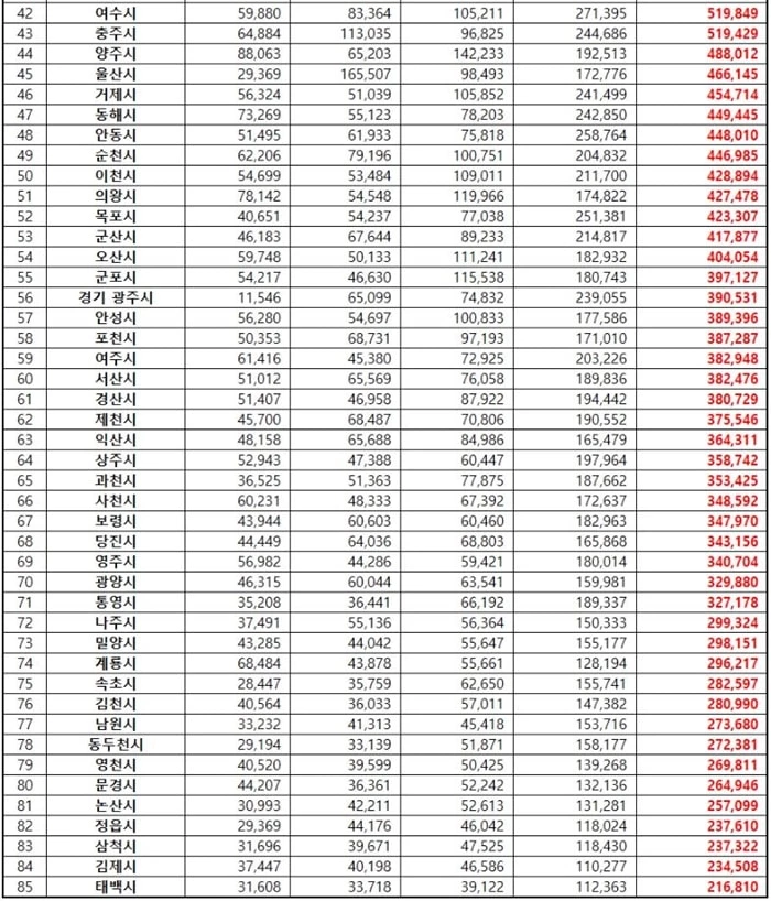 다음은 '5월 대한민국 도시 브랜드평판' 1위부터 85위까지 정리한 표다.