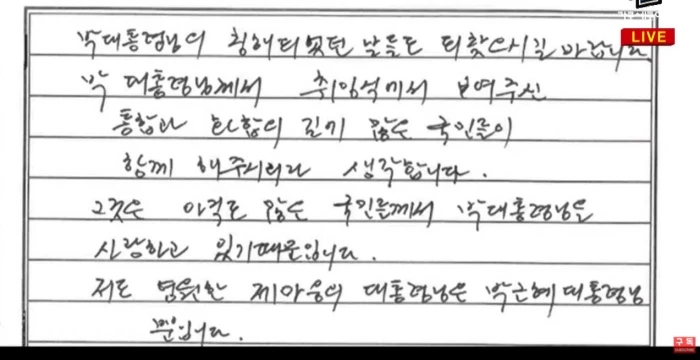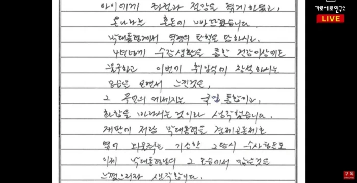 채널 운영자인 유튜버 강용석은 이날 방송에서 최서원 씨가 박 전 대통령에게 쓴 편지 원본을 공개, 직접 그 내용을 읽어줬다.