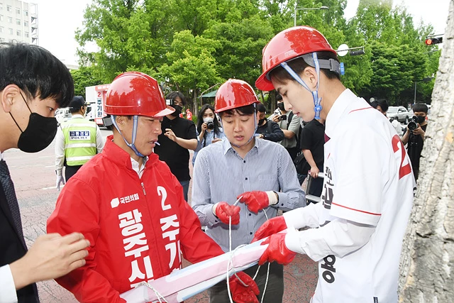 국민의힘 이준석 대표가 주기환 광주시장 후보와 함께 20일 오전 광주 북구 전남대학교 후문 앞 거리에서 전날 훼손된 광주 후보자들의 현수막을 다시 달고 있다.