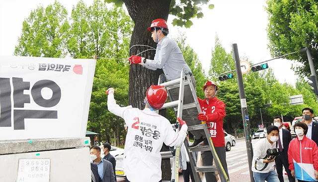 국민의힘 이준석 대표가 주기환 광주시장 후보와 함께 20일 오전 광주 북구 전남대학교 후문 앞 거리에서 전날 훼손된 광주 후보자들의 현수막을 다시 달고 있다.