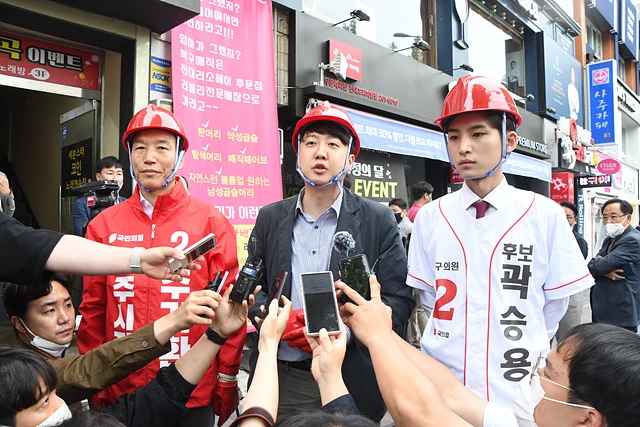 국민의힘 이준석 대표가 주기환 광주시장 후보와 함께 20일 오전 광주 북구 전남대학교 후문 앞 거리에서 전날 훼손된 광주 후보자들의 현수막을 다시 달기에 앞서 기자회견을 하고 있다.