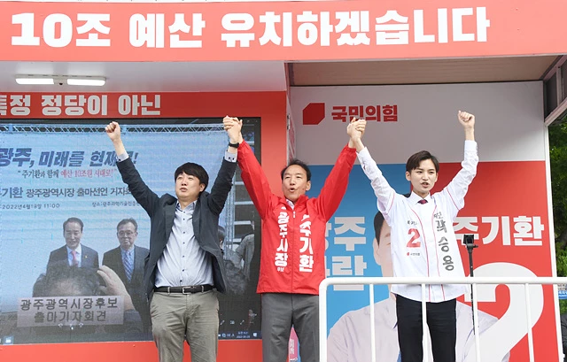 필승 다짐하는 이준석 대표와 주기환 후보·곽승용 광주 북구의원 후보