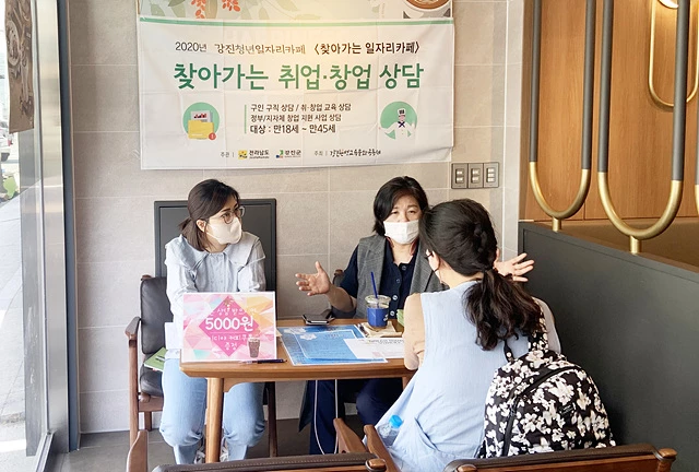 ‘찾아가는 일자리카페’는 상담사들이 청년들이 많이 방문하는 장소를 직접 찾아가 미취업·이직 희망 청년들을 대상으로 취업 상담을 해주고 강진 소재 구인 기업들을 알선해주는 프로그램이다. 청년들에게 다양한 창업 지원 연계 활동, 취·창업 교육 등을 소개해 청년들 간 유기적인 취·창업 네트워크 구축을 목표로 한다.