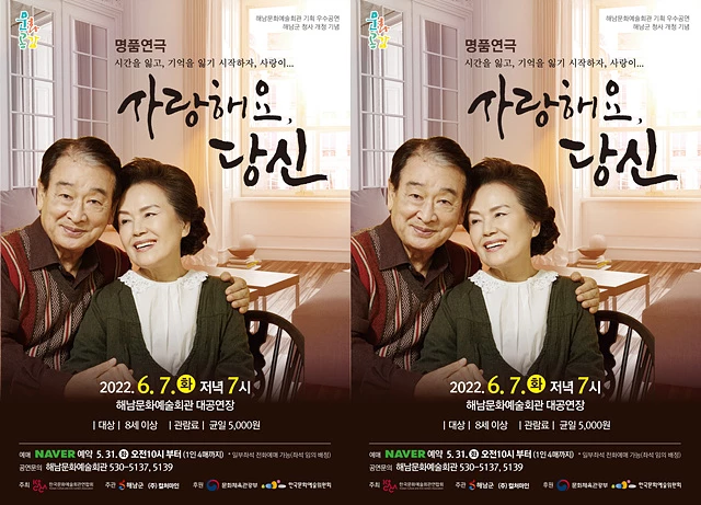 전남 해남군은 문화예술회관 우수공연 기획 및 군 청사 개청 기념으로 연극‘사랑해요, 당신’을 다음달 7일 저녁 7시 군 문화예술회관 대공연장에서 개최한다.