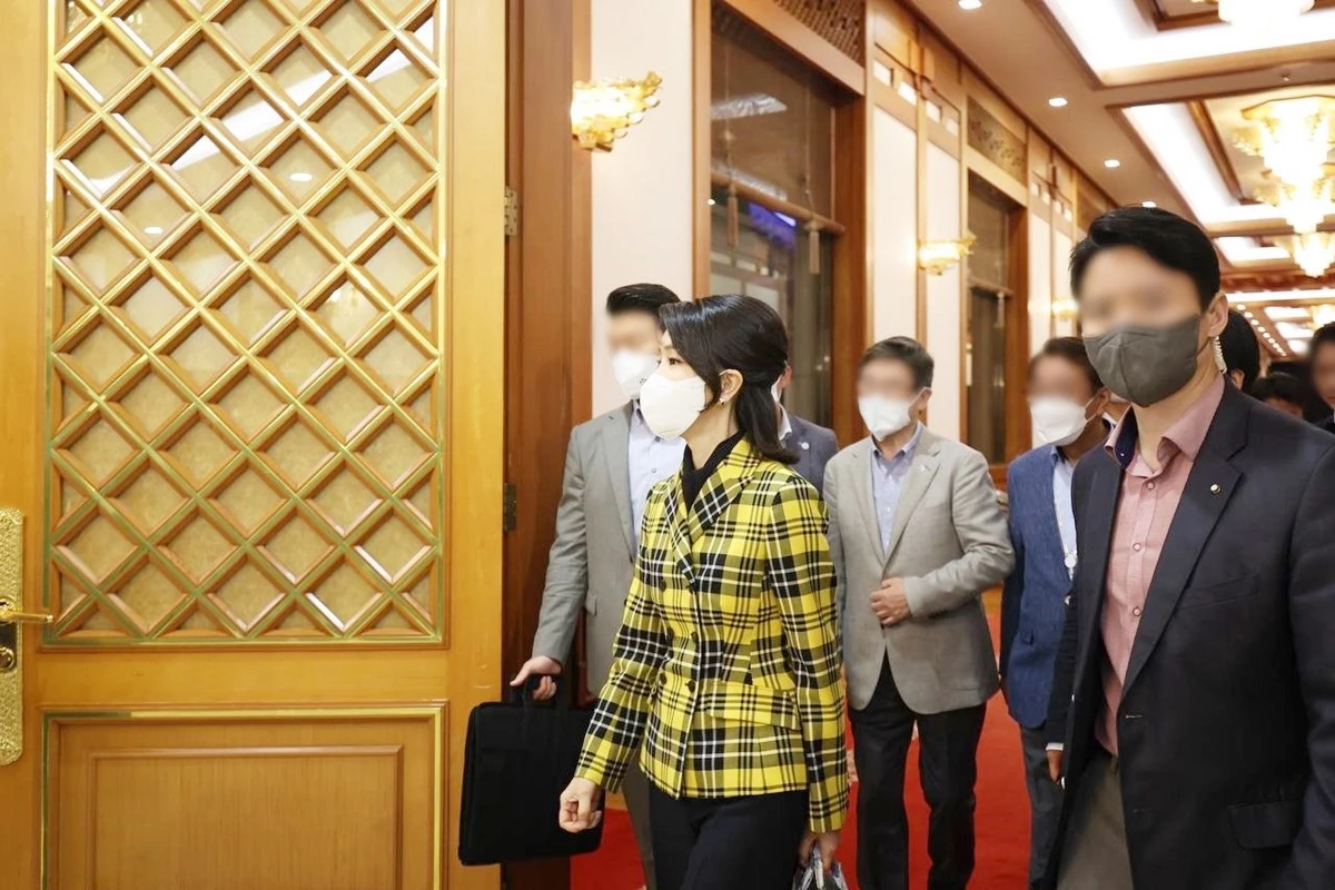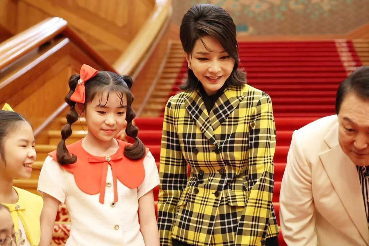 당시 윤석열 대통령은 노타이 차림으로 푸른색 스트라이프 셔츠에 흰색 재킷과 회색 바지를 입었다. 김건희 여사는 노란색 바탕에 검은색 체크무늬 재킷과 검은색 바지 차림이었다. 헤어스타일은 머리를 절반쯤 뒤로 묶은 '반묶음 머리'였다.