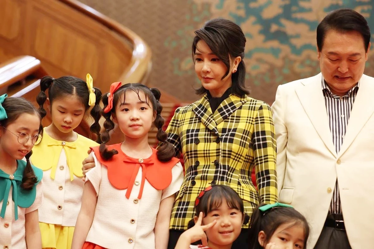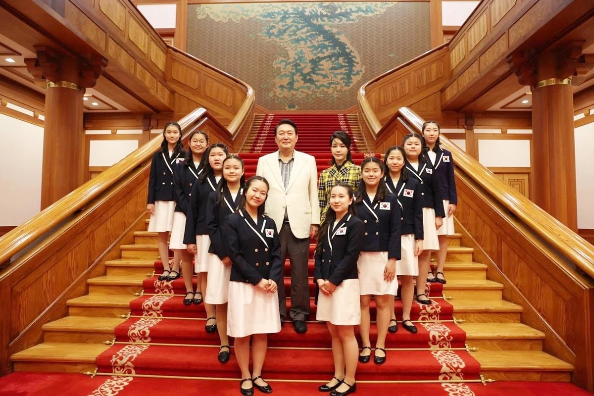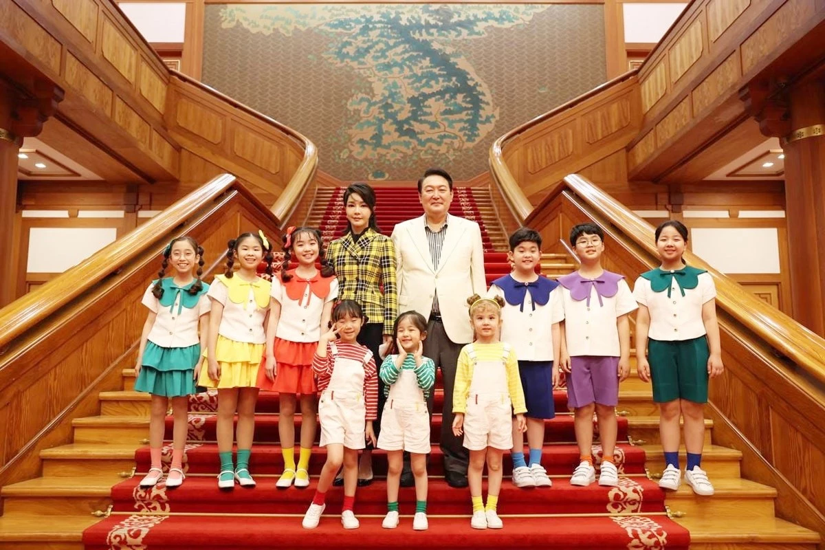 사진 속 윤석열 대통령과 김건희 여사는 청와대 본관 내부에 있는 계단에서 KBS '열린음악회'에 출연한 청소년 합창단원들과 함께 기념사진을 찍었다.