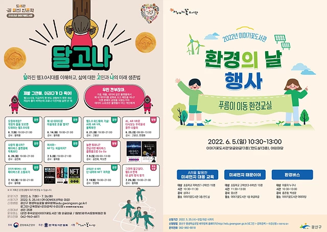 어린이 환경교실과 길 위의 인문학 참여 신청은 광산구 평생학습포털 ‘배우랑께(edu.gwangsan.go.kr)에서 할 수 있다.