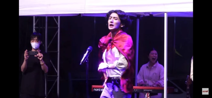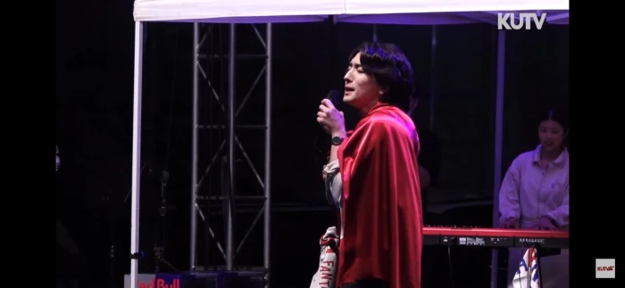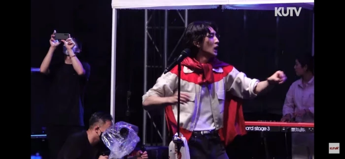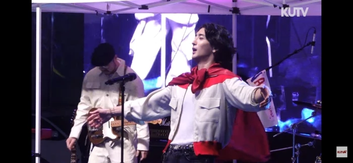 먼저 잔나비 보컬이자 리더인 최정훈은 붉은색 보자기를 둘러매고 무대에 올라 관객 환호성을 끌어냈다. 큰 소리로 환호하는 학생들 소리가 그 인기를 실감케 한다.