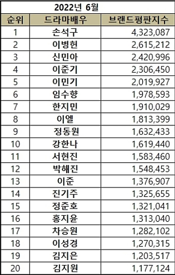 '6월 드라마 배우 브랜드평판' 상위 50위는 손석구, 이병헌, 신민아, 이준기, 이민기, 임수향, 한지민, 이엘, 정동원, 강한나, 서현진, 박해진, 이준, 진기주, 정준호, 홍지윤, 차승원, 이성경, 김지은, 김지원, 황인엽, 이광수, 이서진, 성훈, 이정은, 소지섭, 이경영, 설현, 박주현, 장혁, 홍은희, 김영대, 채종협, 이승연, 신동욱, 곽도원, 차예련, 서지혜, 박지연, 윤두준, 한고은, 이경영, 안보현, 허성태, 김광규, 남상지, 이주빈, 배인혁, 김우석, 조보아 순으로 나타났다.