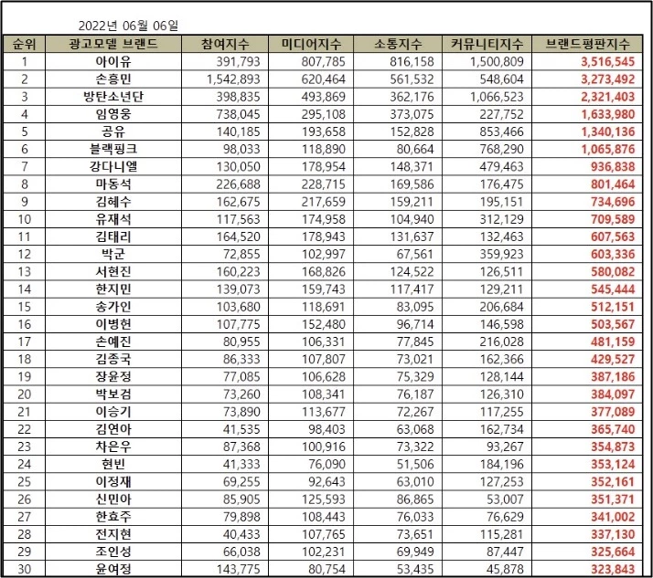 '6월 광고모델 브랜드평판' 순위가 공개됐다.