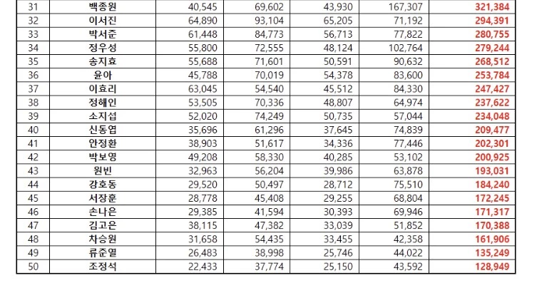 다음은 ‘6월 광고모델 브랜드평판' 1위부터 50위까지 정리한 표와 그래프다.