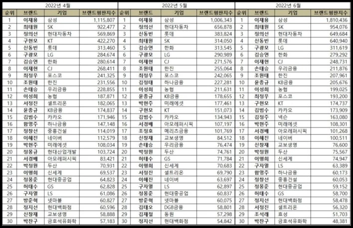 2022년 6월 CEO 브랜드평판 30위 전체 순위는 이재용, 최태원, 정의선, 신동빈, 구광모, 김승연, 이재현, 손태승, 조원태, 윤종규, 이성희, 최정우, 구현모, 김범수, 김정주, 박현주, 서경배, 이해진, 신창재, 박정원, 이명희, 구자열, 함영주, 정창선, 정몽준, 허태수, 정지선, 서정진, 조석래, 박찬구 순으로 나타났다.