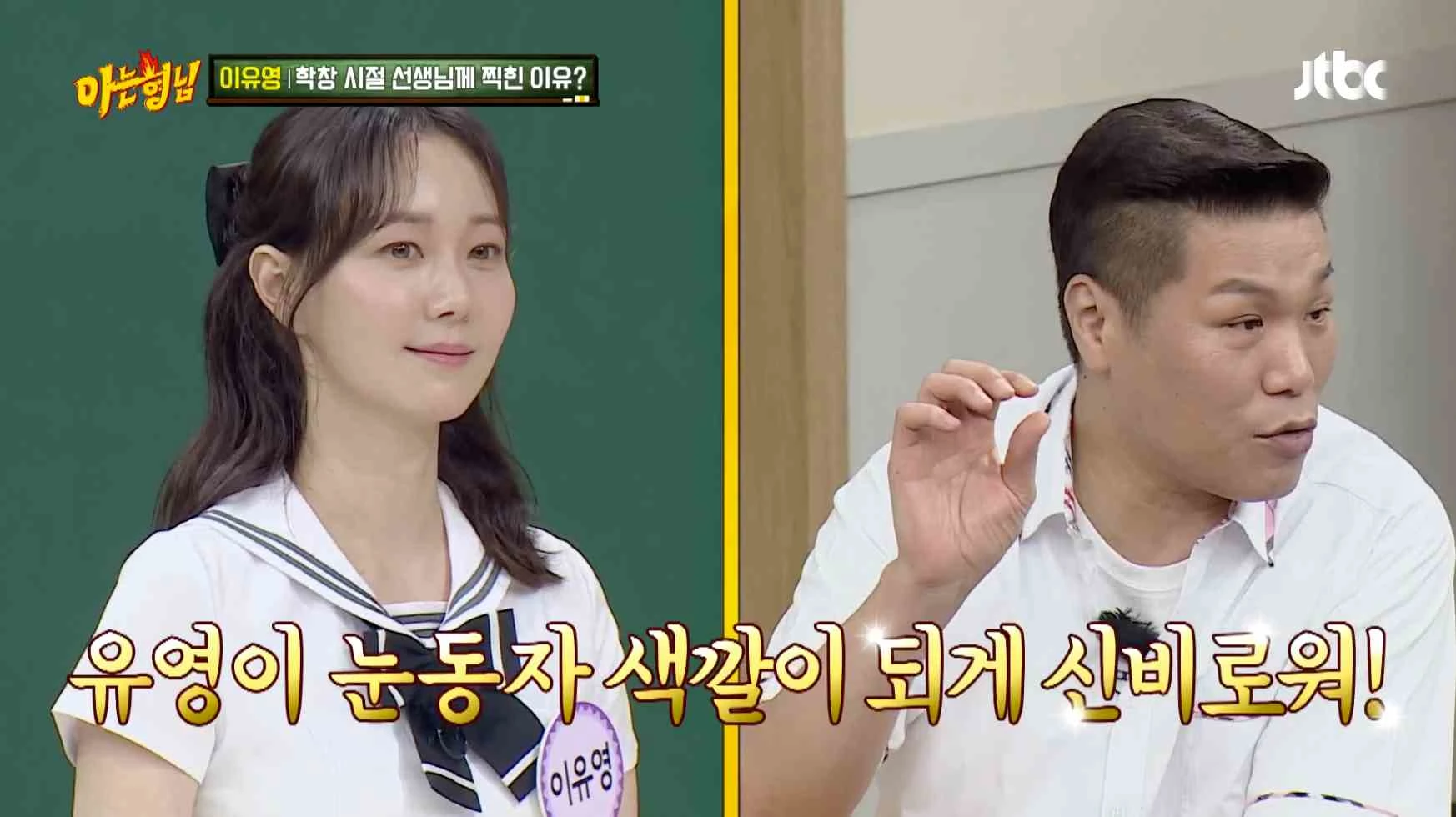 이유영은 학창 시절 선생님께 찍힌 이유를 문제로 냈다. 서장훈은 이유영의 눈동자 색깔에 집중했다. 서장훈은 "선생님이 컬러 렌즈 낀 걸로 의심한 것 아니냐”고 해 정답을 맞혔다.