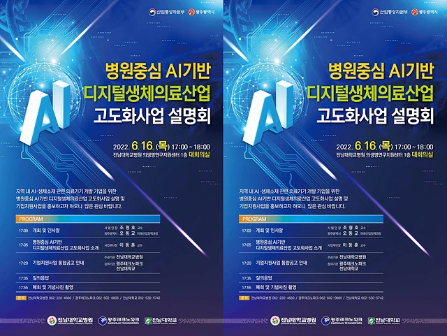 전남대학교병원과 광주시가 인공지능(AI) 기반 디지털 의료산업 거점도시로 도약하기 위해 ‘병원중심 AI기반 디지털생체의료산업 고도화사업’설명회를 오는 16일 오후 5시 의생명연구원 1층 대회의실에서 개최한다.