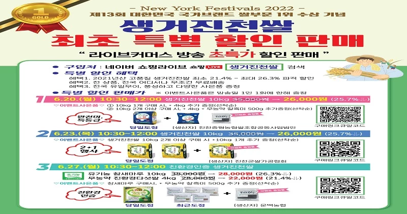 이와 함께 2차 방송 생거진천쌀 10kg 2개 구매 시 선착순 10kg 1개 추가 증정, 3차 방송 참새마루 10kg 구매 시 선착순 무농약 찰흑미 500g을 증정할 예정이다.