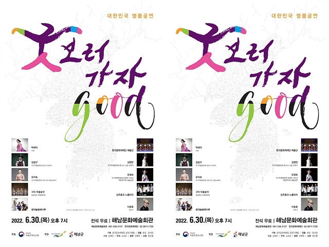 해남군은 대한민국 명품 국악공연‘굿GOOD 보러가자’를 오는 30일 오후 7시 해남문화예술회관 대공연장에서 개최한다.