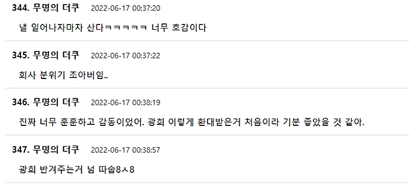 영상을 본 온라인 커뮤니티 더쿠 회원들은 "너무 호감이다", "회사 분위기 좋아 보인다", "분위기가 너무 훈훈하고, 감동이었다", "광희가 이렇게 환대받은 게 처음이라 기분 좋았을 것 같다", "광희 반겨주는 모습이 너무 따뜻하다" 등 다양한 의견을 내놨다.