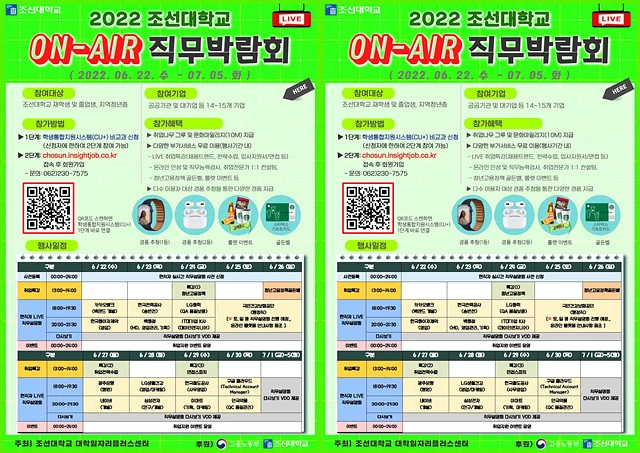 조선대학교 대학일자리플러스센터가 지역거점대학으로서 지역 청년층의 취업 역량 강화를 위한 '2022 ON-AIR 직무박람회'를 개최한다. 이번 직무박람회는 온라인 라이브로 진행돼 장소의 제한 없이 어디서든 참여할 수 있다.