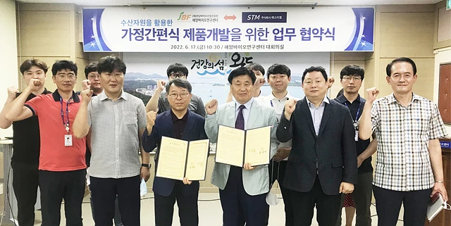 (재)전남바이오산업진흥원 해양바이오연구센터(박희연)는 지난 6월 17일 전남해양수산창업지원센터 사업의 수혜 기업인 ㈜에스티엠과 수산 자원(동죽)을 활용한 가정 간편식 제품 개발 및 기술 이전 추진을 위한 업무 협약식을 가졌다.