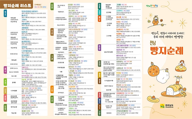 빵지순례도에서 소개하는 지역특화 빵은 목포 목화솜빵, 여수 갓버터도나스, 광양 매화빵, 담양 대나무케이크, 구례 밤파이, 보성 벌교꼬막빵, 무안 양파빵, 장성 사과 발효빵, 장흥 매생이빵, 완도 전복빵, 진도 울금 도넛, 신안 대파빵 등이 있다.
