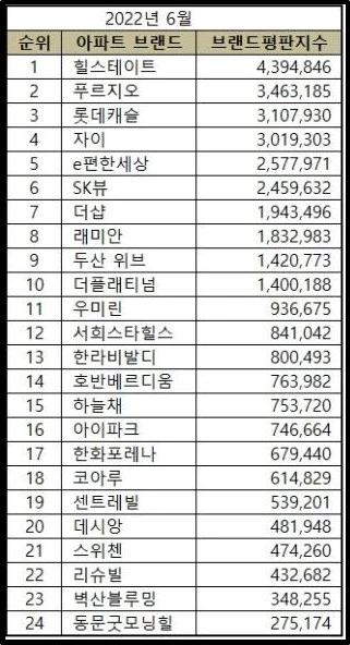 ‘6월 아파트 브랜드평판’ 순위(1~24위)는 힐스테이트, 푸르지오, 롯데캐슬, 자이, e편한세상, SK뷰, 더샵, 래미안, 두산 위브, 더 플래티넘, 우미린, 서희스타힐스, 한라비발디, 호반베르디움, 하늘채, 아이파크, 한화포레나, 코아루, 센트레빌, 데시앙, 스위첸, 리슈빌, 벽산블루밍, 동문굿모닝힐 순으로 나타났다.