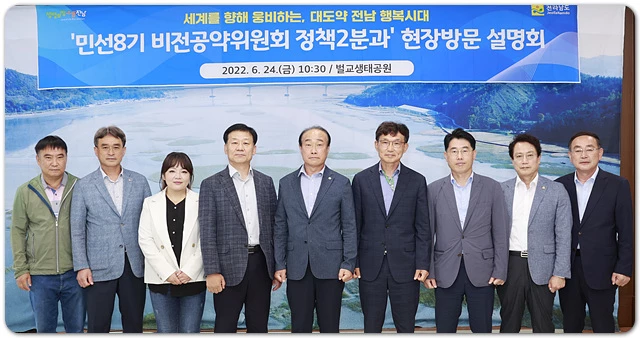 명동주 정책2분과 위원장은 “현장의 목소리를 반영하기 위해 벌교까지 온 위원들과 전남도 실국장들께 감사드린다”며 “발굴된 민선8기 농수산 분야 공약사항과 정책과제를 내실있게 추진해 ‘대도약! 전남 행복시대’를 만드는데 앞장서주길 바란다”고 당부했다.