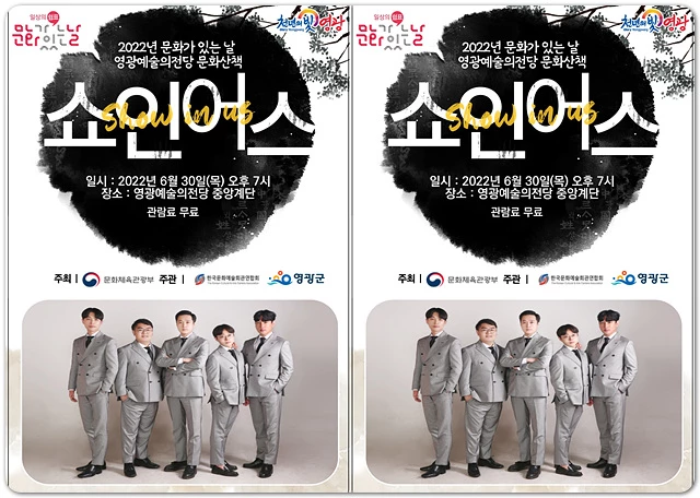 영광군은 오는 30일, 오후 7시에 영광예술의전당 야외공연장(중앙계단)에서 2022년 문화가 있는 날 문화산책 프로그램으로 크로스오버 앙상블‘쇼인어스’콘서트를 선사한다고 밝혔다.