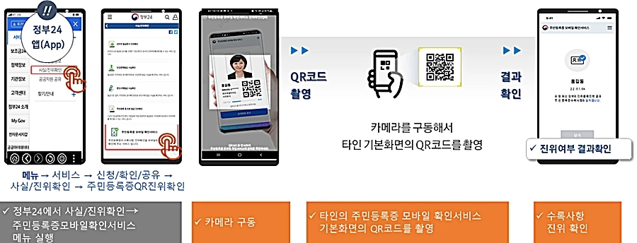 행정안전부는 오는 29일부터 '정부24' 안드로이드 앱을 통해 '주민등록증 모바일 확인서비스'를 시범 운영한다고 28일 밝혔다. '주민등록증 모바일 확인서비스'는 실물 주민등록증이 없이도 주민등록증에 수록된 사항(성명, 사진, 주민등록번호, 주소, 발행일, 주민등록기관)을 QR 코드와 함께 스마트폰 화면에 표출해주고 이의 진위를 확인해 주는 신분확인 서비스다.