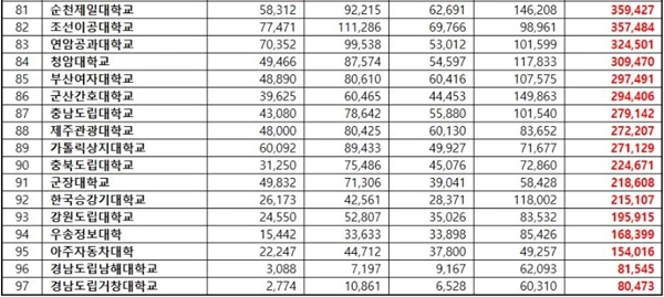다음은 '6월 전문대학 브랜드평판' 1위부터 97위까지 정리한 표다.