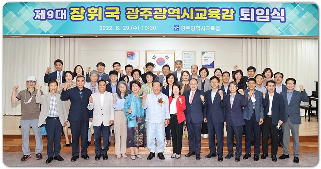 장휘국 교육감은 퇴임식에서 지난 12년 동안의 광주교육을 이끌어온 수장으로서의 소회를 밝혔다. 지난 2010년 취임식에서 발표한 ‘상생 교육, 학생이 중심이 되는 교육, 보편적 교육복지 즉 무상교육, 청렴 교육청, 민주·인권·평화·통일·역사교육, 5·18 정신 계승’ 등을 실현하도록 함께 노력해준 시민들과 교육가족들에게 감사의 마음을 전했다.