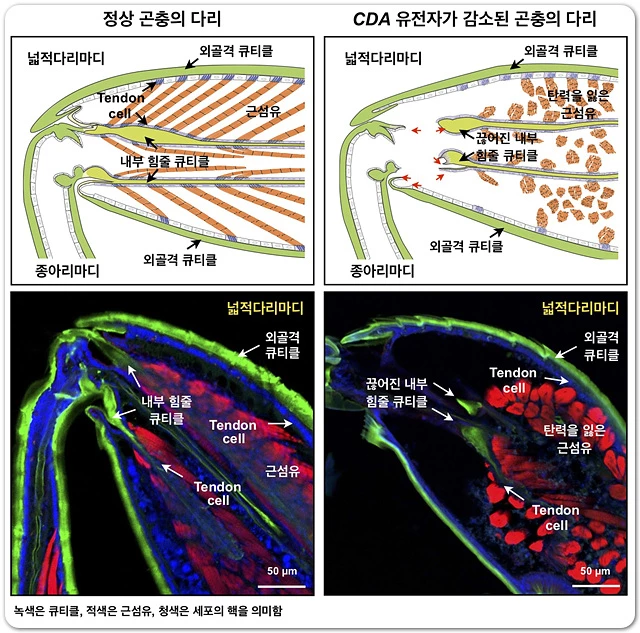 특히 이번 연구에서, 큐티클과 tendon cell이 연결되는 부위에서 CDA와 Dumpy 단백질이 상호작용해 근골격에 연결된다는 점을 규명했고, tendon cell의 미세소관 형성과 근력의 전달에 중요한 역할을 하고 있음도 처음으로 증명됐다.