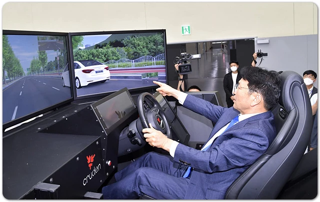 강기정 광주광역시장이 4일 오후 광산구 빛그린산단에 위치한 친환경자동차 부품 클러스터와 인증센터를 방문해 자율주행 차량 테스트를 위한 가상주행시스템을 시연해 보고 있다./광주광역시 제공