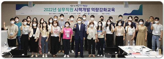 동구는 지난 6월 28일부터 7월 6일까지 지역 맞춤형 시책사업 발굴을 위해 본청·보건소·행정복지센터 소속 7~8급 실무 공무원 70여 명을 대상으로 ‘2022 실무직원 시책개발 역량강화 교육’을 진행했다.