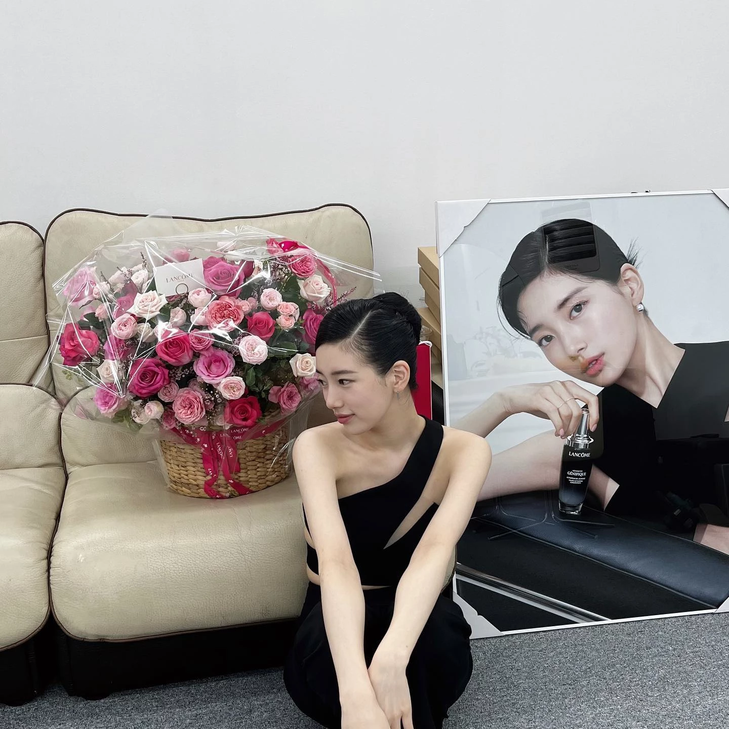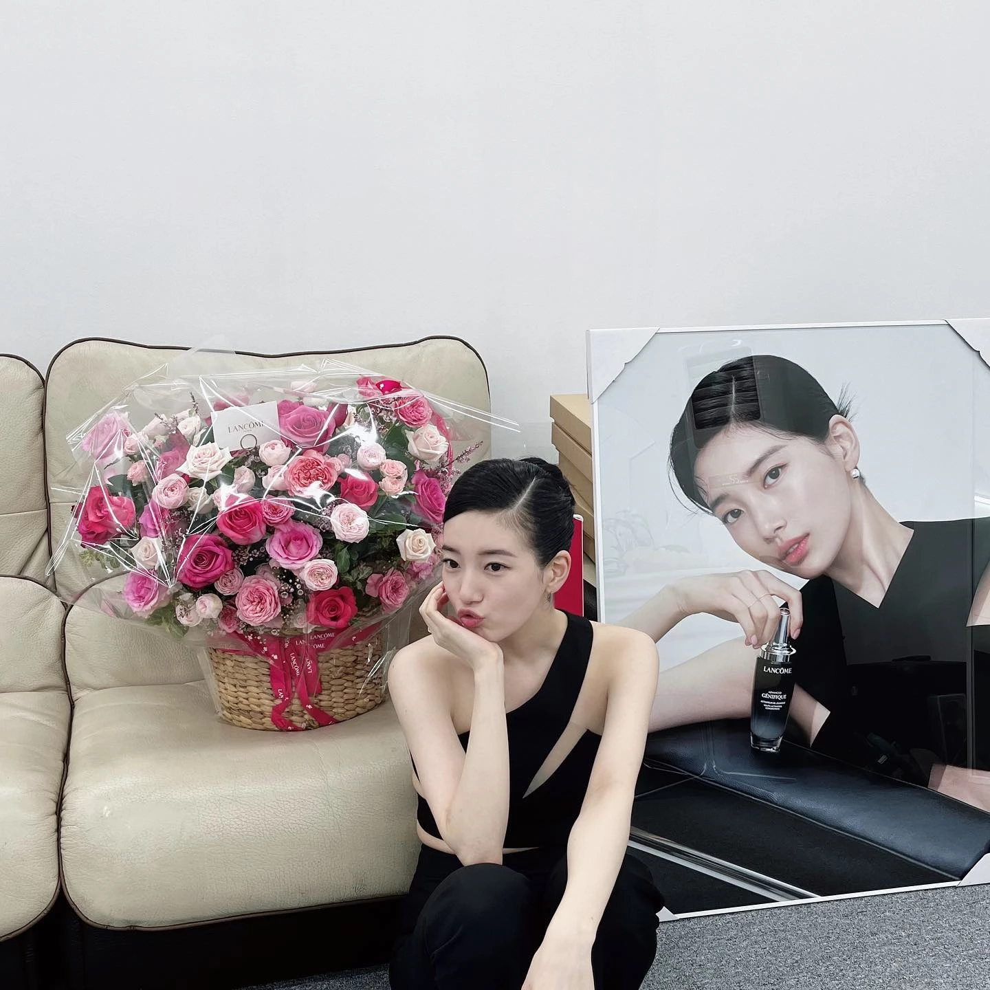 수지는 9일 자신의 인스타그램에 한 브랜드에서 받은 선물을 인증하면서 고마움을 전했다. 수지의 뒤에는 해당 브랜드에서 보낸 꽃바구니와 화보 사진 등이 있다.