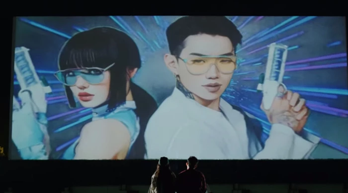 박재범과 노제는 오픈카 좌석에 나란히 걸터앉아 두 사람이 주인공으로 보이는 영화를 감상하고 있다.