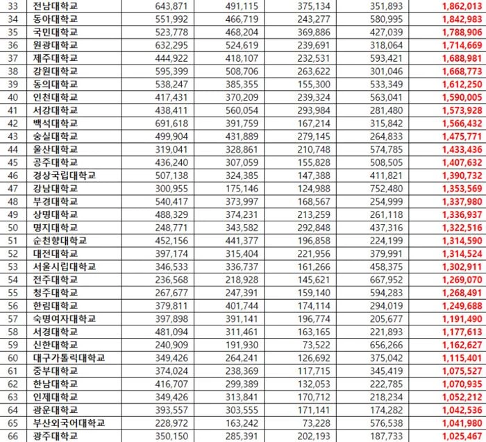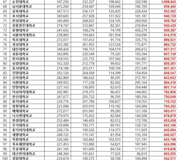 다음은 '7월 대학교 브랜드평판' 1위부터 100위까지 정리한 표다.