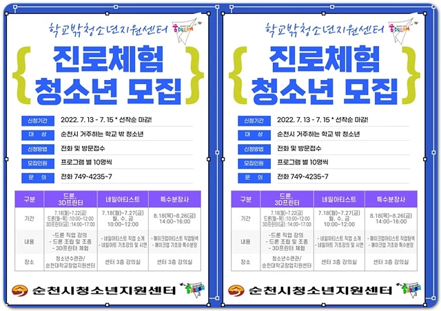 순천에 주소를 두고 있는 학교 밖 청소년이라면 누구나 참여 가능하며, 오는 15일까지 각 분야별 10명씩 모집해 운영할 계획이다.