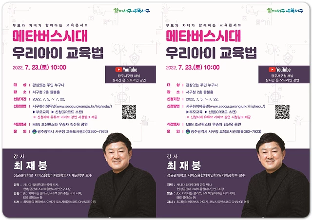 교육콘서트에 참여를 원하는 학부모와 자녀는 서구하이에듀넷 홈페이지(http://seogu.gwangju.kr/highedu/)-부모교육에서 22일까지 신청할 수 있고 사전 신청자에 한해 서구청 유튜브 라이브 강연 시청 링크를 제공한다.