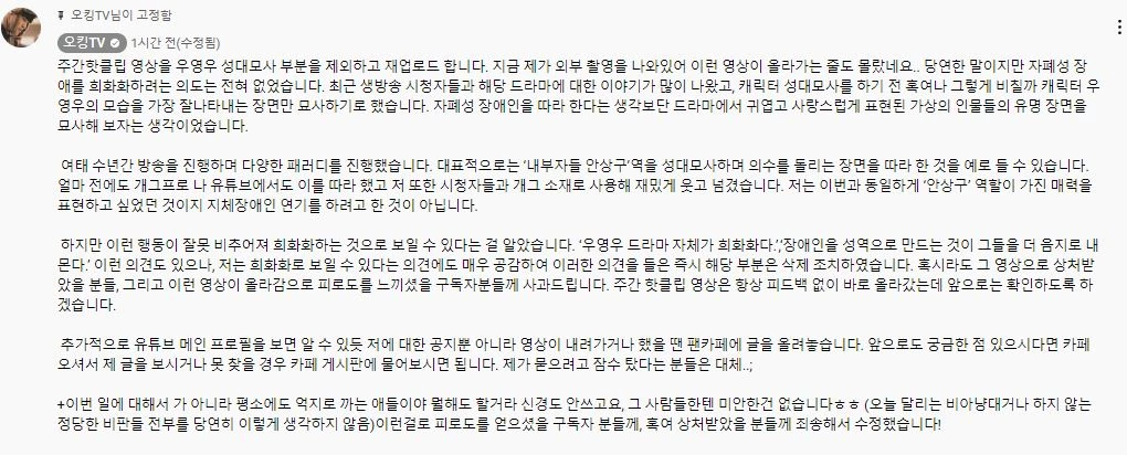 이후 미선짱은 “이 영상 속에서 저는 우스꽝스러운 모습을 하지도, 비하하지도 않았고 모든 자폐를 가지신 분들이 이런 행동을 한다고 유머로 소비한 것도 아니다”라고 해명했다.