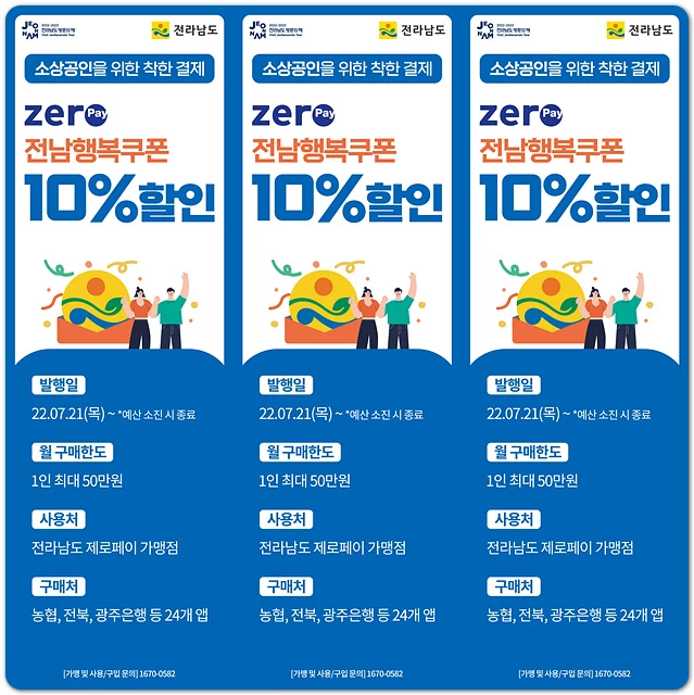 전라남도(도지사 김영록)는 2022~2023년 전남 방문의 해를 맞아 코로나19로 힘든 지역 소상공인과 소비자를 위해 오는 21일부터 제로페이를 10% 할인 가격으로 구매할 수 있는 상품권 ‘전남행복쿠폰’ 발행 이벤트를 개최한다.