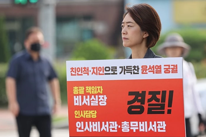더불어민주당 고민정 의원(서울 광진구을)은 지난 19일 오전 서울 용산 대통령실 앞(삼각지역 13번 출구 앞)에서 1인 시위를 펼쳤다. 그는 "윤석열 대통령실의 잇따른 사적채용 문제가 불거지고 있다"며 책임자 경질 및 윤 대통령 사과를 촉구하는 1인 시위를 펼쳤다.
