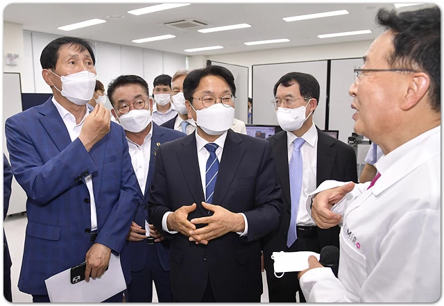 강기정 광주광역시장이 20일 오후 북구 광주테크노파크 2단지에서 열린 '마이크로의료로봇개발지원센터 착공식' 행사를 마친 뒤 한국마이크로의료로봇연구원을 방문해 이학영 국회의원, 정무창 광주시의회 의장 등과 실험실을 둘러보고 있다./광주광역시 제공