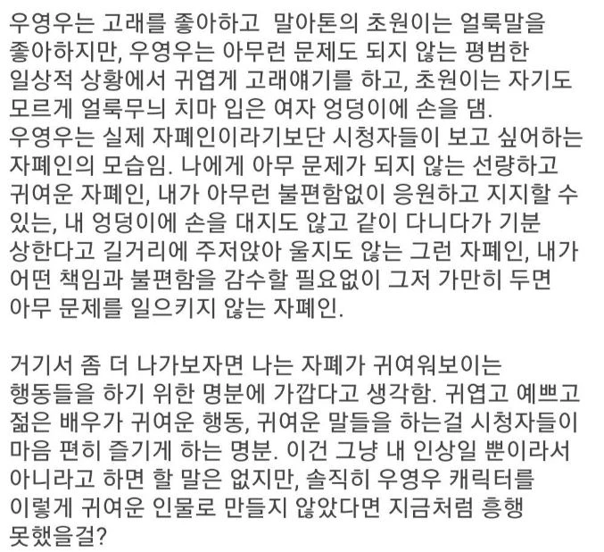 작성자는 "우영우를 자폐인으로 볼 수 있는가", "드라마 '우영우'의 시청자나 제작자나 자폐엔 관심 없고 귀여워만 한다", "그럼 귀여워만 할 것이지 왜 사회적 담론을 담냐"라는 의문과 함께 글을 마쳤다.