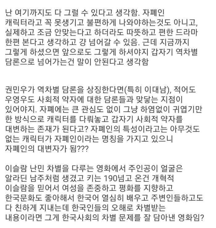 그러면서 "권민우가 이대남들의 역차별 담론을 상징한다면, 적어도 우영우도 사회적 약자들에 대한 담론과 맞닿는 게 있어야 한다"라며 "자폐인의 특성이 없는 캐릭터가 자폐인의 대변자가 되는 건 말이 안 된다고 본다"라고 강조했다.