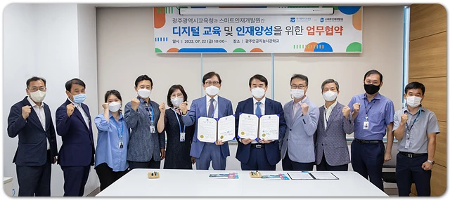 광주시교육청이 22일 인공지능 분야를 포함한 디지털 교육 및 인재 양성을 위해 (사)스마트인재개발원(원장 차준섭)과 ‘광주인공지능사관학교’에서 업무협약을 맺었다.