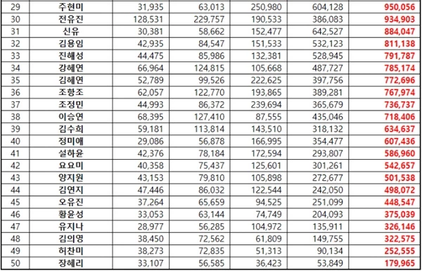 다음은 '7월 트로트 가수 브랜드평판' 1위부터 50위까지 정리한 표다.