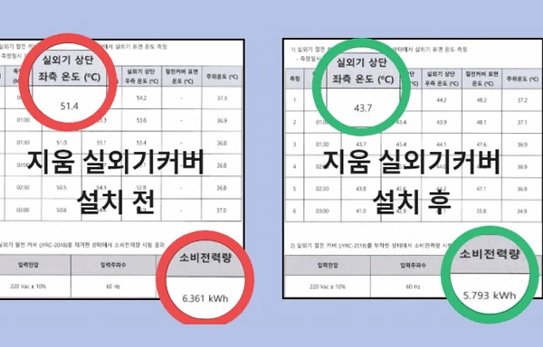 실제 공인인증기관 측정 결과, 설치 전 최대 51.4°C의 가열을 보이던 실외기가 설치 후 43.7°C로 완화되는 모습이 확인됐다. 소비전력량도 약 600kWh 줄어들었다.