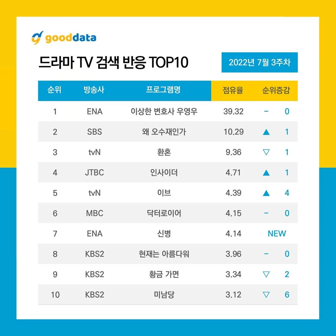 TV 화제성 조사 기관 굿데이터코퍼레이션은 28일 '드라마 TV 검색반응 / 검색 이슈 키워드 톱 10(7월 3주차)' 리스트를 공개했다.