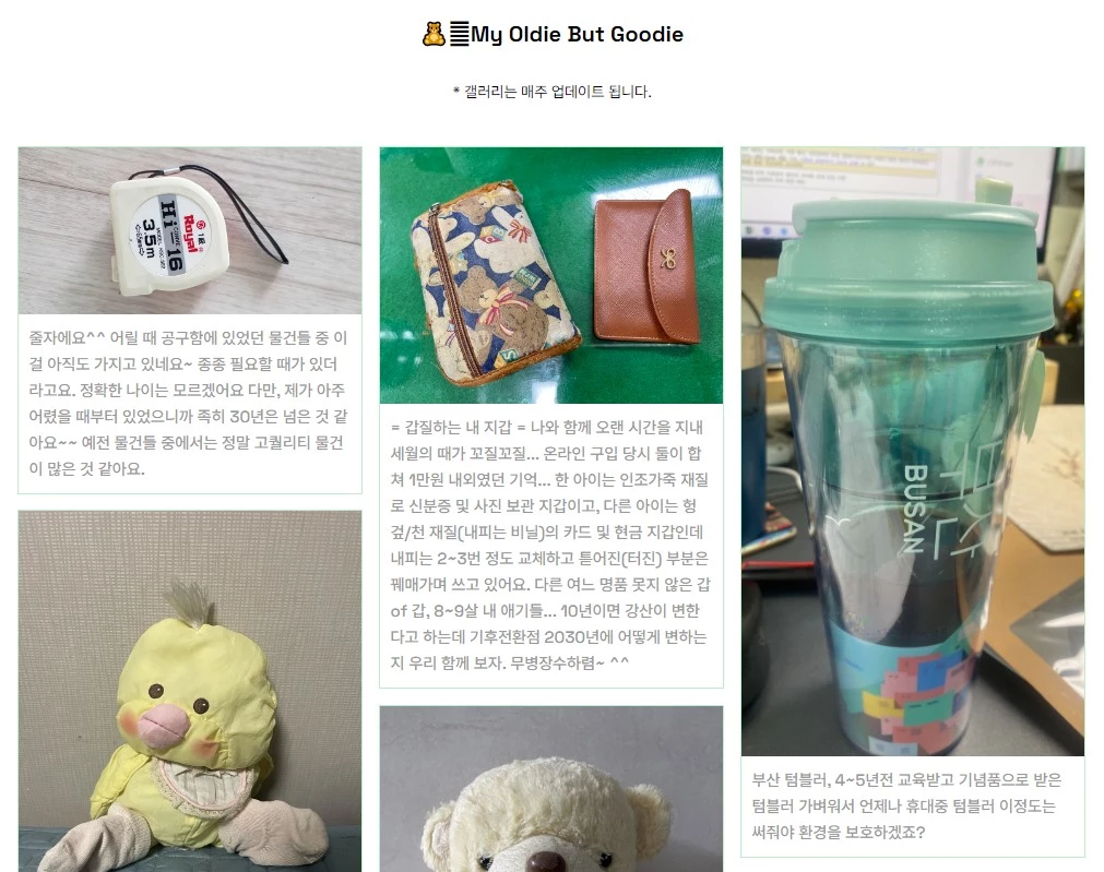 이 전시는 서울환경연합에서 주최하는 온라인 전시로, 전시의 이름인 ‘My Oldie But Goodie’는 오래됐고 구식이지만 여전히 좋은 것을 뜻한다. 환경 보호에 있어서 재활용도 물론 중요하지만, 이미 생산된 자원을 버리지 않고 계속 사용하는 것을 권장하는 것에서부터 시작된 전시라고 말할 수 있다.