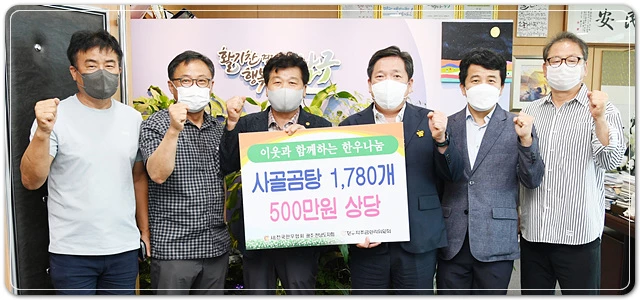 전국한우협회 광주전남지회 김재영 회장과 임원진은 8일 광주시 남구청을 방문, 어려운 이웃을 돕기 위한 한우사골곰탕 1,780개(500만원 상당)를 김병내 남구청장에게 전달했다.